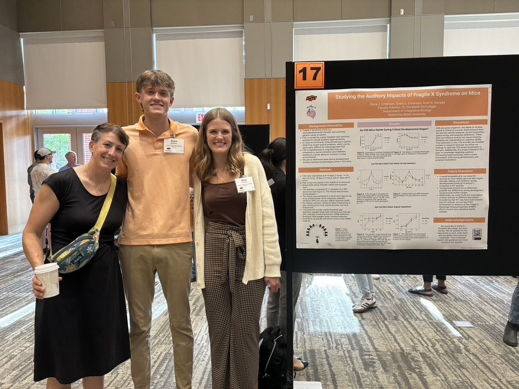The McCullagh lab was represented well at the Undergraduate research symposium! Jorja (left) also presented at the Human Performance and Nutrition Research Institute and got a poster prize as well as receiving a Niblack scholarship this year on her work on Alzheimers and estrogen deficiency in collaboration with Ed Lucas. Avery and Kami (middle picture) presented their work on hormonal expression in the auditory brainstem of wild rodent species (not picture Josh who is also working on this project). Grant and Olivia Emerson presented their work on Fragile X Syndrome mouse auditory behavioral development (right picture). Grant also received a Wentz fellowship this year.